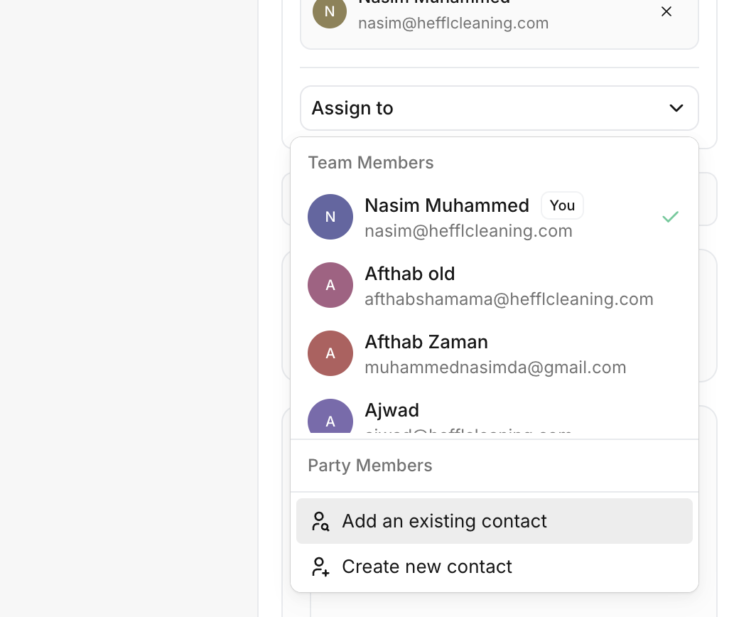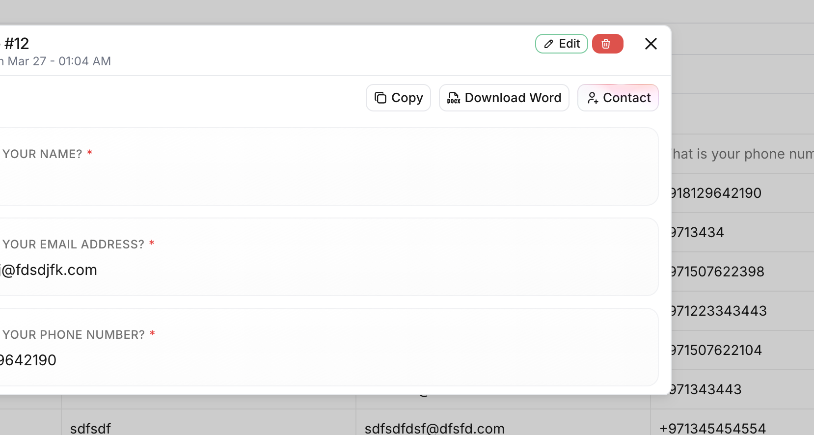 - Form responses detect the submitter's name, email, and phone automatically. A Create contact button turns any submission into a CRM contact in one click, and if a contact with that email already exists the modal links straight to it.