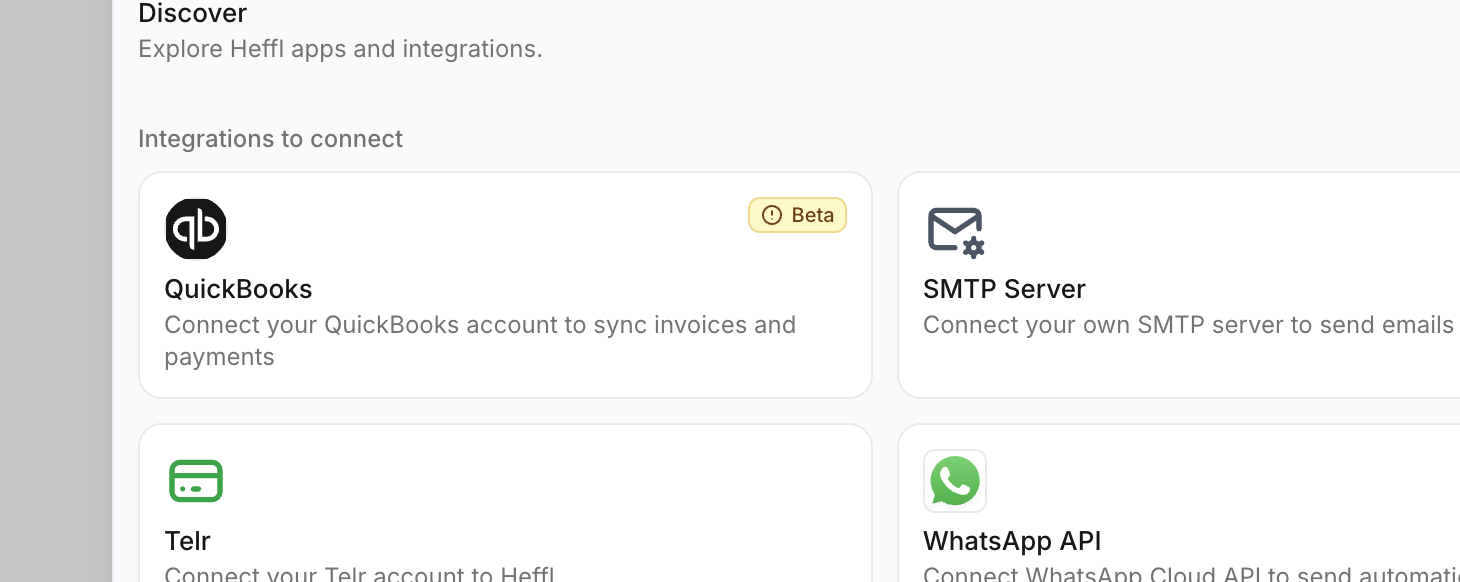 Connect Heffl to QuickBooks from the integrations page. Invoices created in Heffl flow through to QuickBooks, keeping your accounting in sync without double entry.